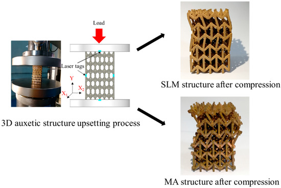 In order to compare the mechanical property of the SLM with the MA structure, bronze C5131 is applied in both of these two processes. The compression test is conducted on a Zwick/Roell Z050 testing machine, which is connected with a VideoXtens extensometer. Laser tags are bound on the top, bottom and both sides of the structure, and the maximum resolution of the extensometer is 0.01 μm. The punch speed of the testing machine is set to 0.1 mm/min to avoid the influence of strain rate, as shown in Figure 3. The horizontal and vertical strain is obtained via the video extensometer and the Poisson’s ratio is thus calculated.