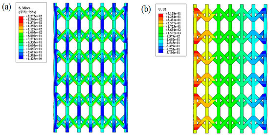 FE simulation of compression test of the 3D auxetic structure: (a) Stress distribution (b) Stroke distribution.