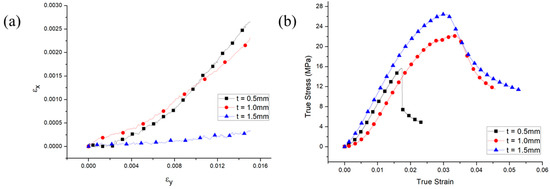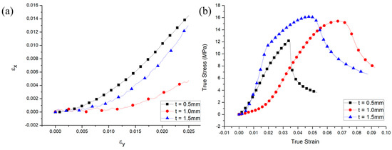The Poisson’s ratio εx-εy curve and stress-strain curve of MA auxetic structure of different pillar thickness. (a) εx-εy curve (b) Stress-strain curve.