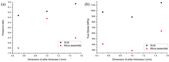 By comparing the mechanical properties of SLM and MA structure, it is found that the auxetic effect exists in both structures during the compression test. The auxetic effect is more obvious in MA structure as the absolute value of the Poisson’s ratio is larger than SLM structure, as shown in Figure 7a. Although the accuracy and clearance of each component has reduced the Young’s modulus of the MA structure, the comparison of the mechanical property between SLM and MA structure still proves that microforming and micro-assemble process is an effective way for manufacturing complex 3D auxetic structure. Meanwhile, it is found that another reason of the difference of the Young’s modulus of MA and SLM structure may be caused by the coarse grains due to sudden temperature change during the manufacturing process of SLM structure. The Young’s modulus of both structures decreases and then increase when the thickness of the pillar increases, as shown in Figure 7b.