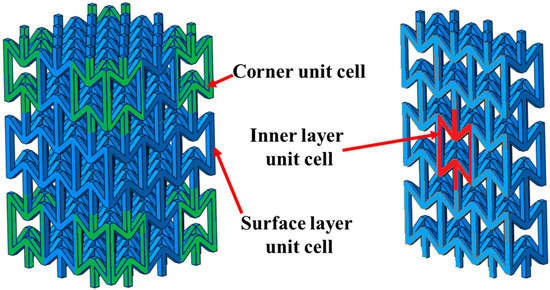 In this research, the so-called structural size effect is discovered and the structural surface layer model is provided to explain this phenomenon. As the 3D auxetic structure is consisted of several unit cells with the same size, the unit cells can be classified into corner unit cell, surface layer unit cells and inner layer unit cells, which is similar to previous research [26]. The corner unit cells and the surface layer unit cells have free surfaces while the inner layer unit cells haven’t, as shown in Figure 9. The unit cells in the central area, which are marked with red, are defined as the inner layer unit cells. The corner unit cells and surface layer unit cells have at least one free surface, which are marked with green and blue.