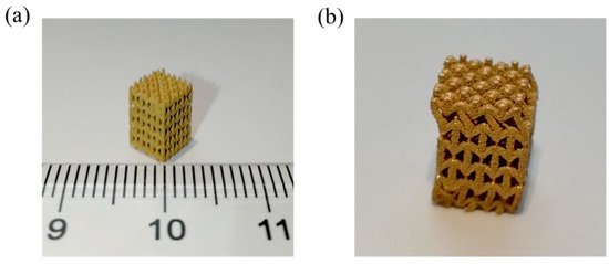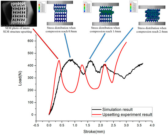 In order to examine the accuracy of the model above, the SLM auxetic structure contains 3 × 3 × 3 unit cells with smaller size are manufactured, as shown in Figure 10a. Its overall dimension is 4.8 × 4.8 × 7.8 mm. The compression test is conducted and the result is compared with simulation result.
