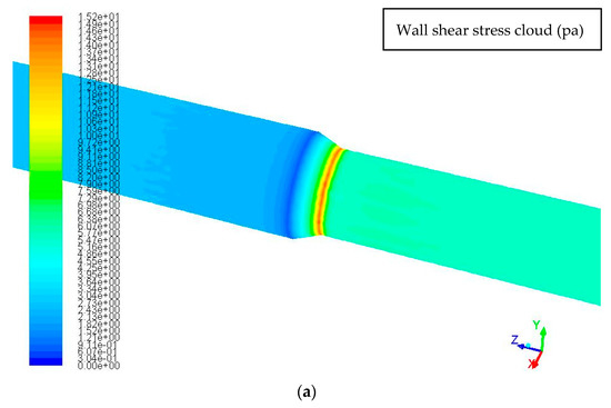 - From the wall shear stress cloud, along the direction of fluid flow, wall shear stress in the inlet section of the pipe diameter decreases before the basic unchanged, and the value is small; when the pipe diameter decreases (the left side of the tapered tube), wall shear stress and the size of the outlet pipe diameter is inversely proportional; when the pipe diameter decreases to the same diameter as the outlet pipe (the right end of the tapered tube), the wall shear stress at this location reaches its maximum value.