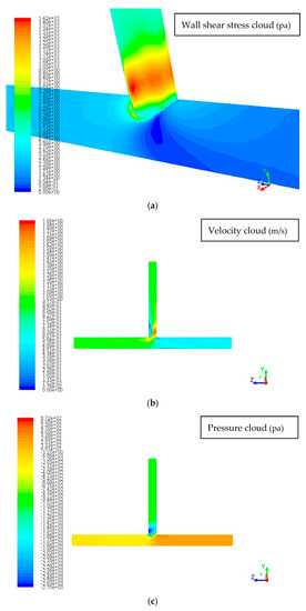 - Comparing the magnitude of wall shear stress of different pipe diameters under any flow, it can be obtained that the vertical outlet pipe diameter of the tee pipe is inversely proportional to the maximum wall shear stress; that is, the risk of erosion of the tee pipe is subsequently reduced.