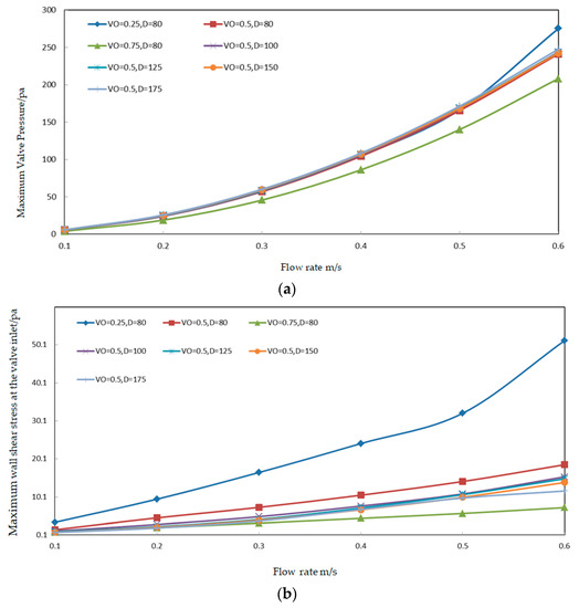 - when the flow rate is constant, the maximum wall shear stress and pressure are reduced as the outlet diameter increases, i.e., the taper of the conical tube decreases;