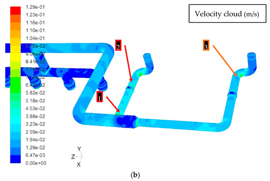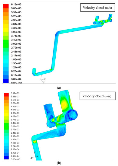 - From the velocity cloud, we can get that the velocity of the inlet pipe section remains basically unchanged, and the flow velocity increases where the wall shear stress increases, and the velocity reaches the maximum in the area of the vertical branch pipe near the horizontal direction side, which is the same as the wall shear stress position.