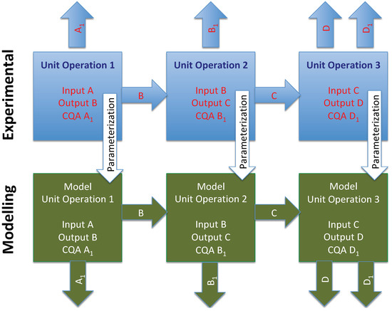 Hence, over the last years, several combined end-to-end process models have been developed, which are often called integrated process models, end-to-end bioprocess models, holistic process models, bioprocess replicas, flowsheet models or bioprocess digital twins [1,4,21,22,23,24,25,26]. Despite the fact that certain differences in the underlying methodology and concepts are evident, all approaches offer the study of process parameter settings across all unit operations in terms of global optimization. However, the coupling of models between the individual unit operations is still a challenging task (Figure 1). A consistent and combined multidimensional approach to estimate parameter ranges for predictions has not been conclusively proposed. Recent approaches suggested a Monte Carlo sampling scheme [22,25], whereas other publications favored a progression of discrete values for further processing steps also in terms of model-predictive control strategies [27,28,29]. In more detail, it was shown that the detailed evaluation of process parameter ranges crucially affects the outcomes [22], such that the detailed consideration of coupled effects for all models is of utmost importance.