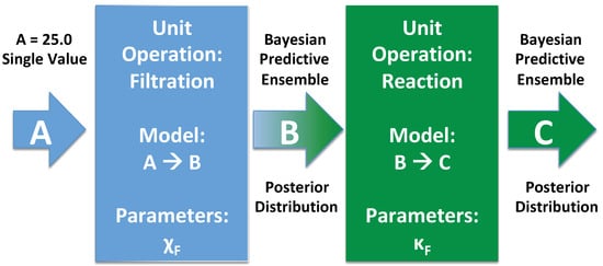 with the rate constant , and . The choice of such simple equations for unit operations allows us to calculate values of B and C analytically and to compare the outcomes with the model predictions accordingly. Furthermore, we can discuss basic features of the method without having to focus on specifics of more complex unit operations. In terms of a combined approach, the individual models were coupled to predict the outcomes of a holistic process model for the filtration and the reaction step. The coupled unit operation steps are schematically shown in Figure 2. The first unit operation model predicts the concentration B from a fixed value of the concentration A in accordance with Equation (30). From the corresponding posterior distribution of B as calculated by the Bayesian predictive ensemble, certain values were randomly drawn, which are then used for the calculation of C in accordance with Equation (31). Noteworthy, we limit the calculations to only six training data points for each unit operation in order to mimic realistic settings for parameterization purposes.