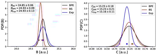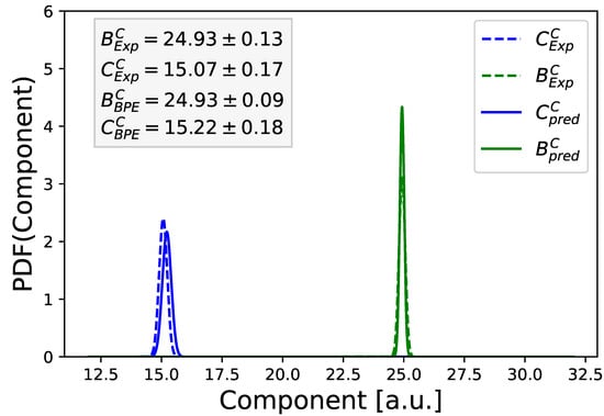 Moreover, we included point-like predictions for B and C for the corresponding values from the full GP and the full LR model. As can be seen, the best ML models provide good estimates but no reasonable standard deviation for estimating the model uncertainty. However, their usage as mean value for the prior distribution function allows us to improve the corresponding values for the posterior distribution function. Hence, it can be concluded that the combination of both aspects in terms of the Bayesian predictive ensemble calculations provides good estimates for model outcome ranges and mean values.