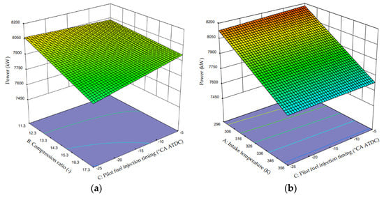 Surface plot of power with input variables. (a) Intake temperature = 316 K; (b) Compression ratio = 13.3; (c) Pilot fuel injection timing = −15 °CA ATDC.