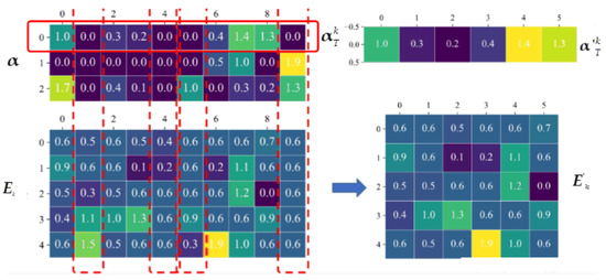 It is necessary to find the optimal solution of to obtain the minimum error. This is a least square problem, which can be solved by the least square method or singular value decomposition (SVD). In this paper, the SVD method is utilized to solve the optimal solution of two variables. However, if is directly used to solve this, the sparsity of obtained will be larger or no longer sparse, such that the elements corresponding to zero elements in and can be eliminated here to form a new residual matrix , as shown in Figure 2.