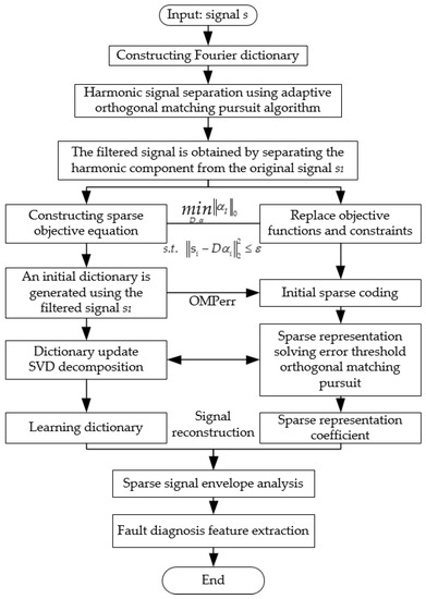 The overall method of bearing fault feature extraction based on adaptive OMP and improved K-SVD is given in Figure 3.