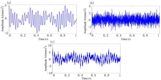 Synthetic signal time-domain waveform. (a) Harmonic signal; (b) noise; (c) composite signal.
