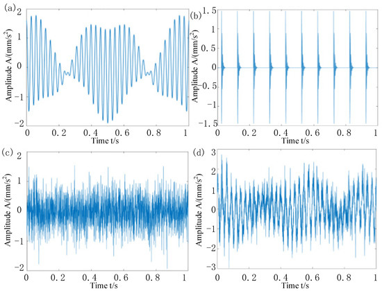 Synthetic signal time-domain waveform: (a) harmonic components; (b) impact component; (c) noise; (d) synthetic signal.