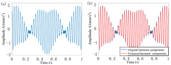 The adapOMP algorithm extracts harmonic components. (a) Adaptive extraction of the harmonic components’ time-domain waveform; (b) comparison of the extracted harmonic components and original harmonic components.