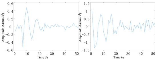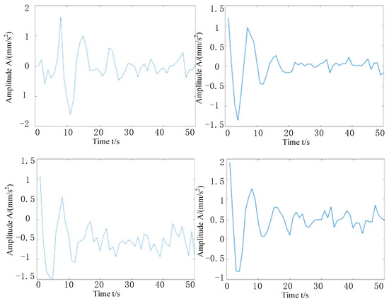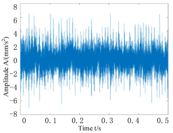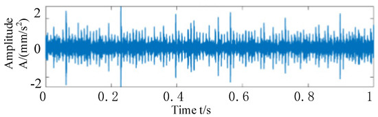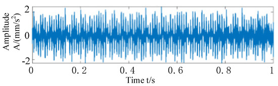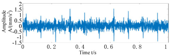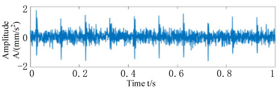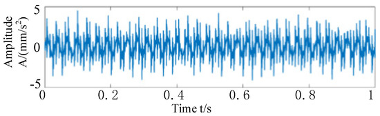 First, a Fourier dictionary conforming to the waveform of the harmonic components is constructed, and the harmonic components in the synthesized signal are separated by an adaptive quadrature matching pursuit algorithm. The iteration stops when the largest element in the sparse vector is five times or more the smallest element, and the harmonic components are separated from the composite signal. Through the calculation, it can be shown that the sparseness of the harmonic and modulation components of the simulated signal is 4, which appear at the disposal of the points, and their values are 2 respectively. In the obtained sparse matrix, all of the coefficients except these four points are zero. Finally, the Fourier dictionary is used to multiply the sparse coefficient matrix to obtain the harmonics and modulation components in the simulated signal, as shown in Figure 7a. The harmonic components are plotted in the same graph as those extracted from the simulated signal by adaptive quadrature matching tracing, with the original harmonic components in red and the adaptive quadrature matching tracing extracted from the simulated signal in blue. The extracted harmonic components are shown in Figure 7b; it can be seen that the extracted harmonic components are very similar to the original harmonic components, and the correlation is calculated by the corroded function to obtain 0.9967, which shows the effectiveness of this method in eliminating harmonic components. When the harmonic components are removed from the simulated signal, as shown in Figure 8, the combined time-domain waveform of the remaining impulse components and noise can be seen, which further proves the effectiveness of the method in separating the interference of harmonic components.