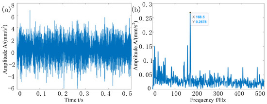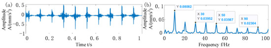 Result of the test bearing. (a) Time-domain waveform of the vibration signal; (b) envelope spectrum of the vibration signal.