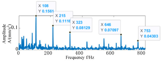 In the experiment, the rotating speed of the motor is 1797 r/min, the rotating frequency is 29.95 Hz, and the fault frequency of the outer ring of the rolling bearing is calculated to be 107.36 Hz. In total, 12,000 data points in 1s were intercepted for the experimental analysis. In order to reflect the performance of the algorithm proposed in this paper for the processing of long signals, is added to the original signal, where the harmonic components of and Gaussian white noise with variance 1 and mean 0 are added to the original signal. The difficulty lies in extracting the transient pulse component in the signal to be detected. Its time-domain waveform diagram within 0–1 s is shown in Figure 15, and the transient impulse components are all submerged in noise and harmonic components. The envelope spectrum analysis is performed on the signal after adding noise, and the obtained envelope spectrum is given in Figure 16. It can be seen that due to the influence of noise, only the first and second harmonic of the fault frequency can be observed; the other multiple frequencies are not obvious, and the higher harmonic is more prominent.