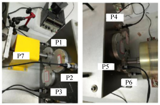 Using the HG-8916 data acquisition system, the maximum number of sampling points of the signal acquisition card is 32,768, and the maximum sampling frequency is 50 kHz, which is saved in format and imported into MATLAB for analysis. Owing to the limited conditions during the experiment, only the acceleration sensor could be installed on the outside of the gearbox to collect vibration data. Sensors are mounted on seven positions in total (P1−P7 in Figure 23). A piezoelectric accelerometer is placed at the point, mainly collecting vibration data, and a laser speed sensor is installed at the number 7 measuring point, mainly measuring the motor speed. The experimental bearing is an ER-16 K deep groove ball bearing, which supports the input shaft of the drive end. The bearing parameters are given in Table 4.