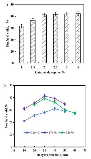 Dehydration conditions have profound influences on the furfural generation [28,29,30]. To improve Sn-DAT-SS’s dehydration ability, three parameters (e.g., Sn-DAT-SS loading, dehydration temperature, and dehydration time) were investigated on the influence of furfural formation in the aqueous media. The yields of furfural increased when the loadings of Sn-DAT-SS were raised from 1 to 2 wt %. Using 2 wt % loading of Sn-DAT-SS as a catalyst, the yield of furfural was 41.3%. Upon increasing Sn-DAT-SS’s loading from 2 to 4 wt %, no significant change was observed on furfural yields (Figure 1a). An excessive Sn-DAT-SS dose did not increase the acidity of catalytic media, which could not promote the furfural formation. Hence, the optimum Sn-DAT-SS loading was 2 wt %. The dehydration temperature and duration also have key roles in the valorization of biomass-derived xylose into furfural (Figure 1b). At different dehydration temperatures (160, 170, and 180 °C), the highest furfural yields were obtained as follows: Yield (170 °C, 30 min) = 41.3% > Yield (180 °C, 30 min) = 39.3% > Yield (160 °C, 40 min) = 31.0%. The optimum dehydration temperature and time were 170 °C and 30 min, respectively. A lower dehydration temperature might not supply sufficient energy to dehydrate xylose into furfural. At higher dehydration temperatures, it is evident that furfural shows signs of degrading, resulting in lower yields and the generation of unwanted byproducts [31]. In summary, the optimum Sn-DAT-SS loading, dehydration temperature, and time were 2 wt %, 170 °C, and 30 min, respectively. Under the optimum dehydration conditions, corncob-derived xylose (20.0 g/L) could be dehydrated to furfural (80.0 mM) with the yield of 41.3% (based on the xylan weight in corncob).