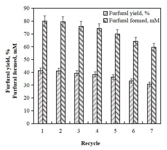 The reuse of chemocatalysts is crucial in the industrial production of furfural [14,32]. In order to test the performance stability of shrimp shell-supported tin-based solid acid Sn-DAT-SS catalysts, recovered and repeated reuse of Sn-DAT-SS was carried out for seven batches. As depicted in Figure 2, furfural yield arrived at 41.3% in the first run. In the second run, no significant change was observed in the furfural yield. After the second run, the yields of furfural decreased. From the second to the seventh run, the yields decreased from 41.1% to 30.8%. From the first to the seventh run, the furfural concentration was in the range of 60–80 mM. SO42−/SnO2-attapulgite, SO42−/SnO2-DM, and Cl0.3-S-R could be reused for five batches [14,33,34]. CSUTS-CSW was reused for seven batches [35]. The Sn-DAT-150 SS demonstrated high stability for the dehydration of xylose to furfural under the synthesis conditions tested.