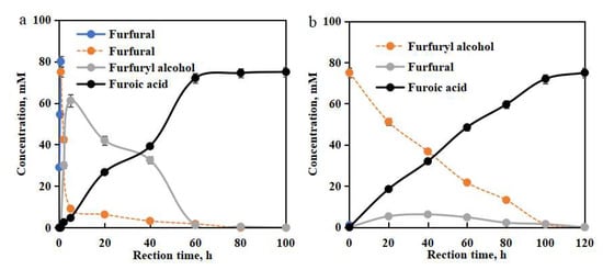 HMFOMUT cells were utilized as biocatalysts for transforming dilute xylose-derived furfural (75.0 mM) into furoic acid. Within 5 h, the generation rate of furfuryl alcohol was quicker than that of furoic acid. In 5 h, furfuryl alcohol was achieved at the maximum (61.2 mM), while furoic acid was observed at 4.7 mM. After 5 h, furfuryl alcohol was biotransformed into furoic acid. Upon bioconversion for 60 h, furfural was converted into 72.0 mM furoic acid with the yield of 96% (based on the furfural) (Figure 4a). Upon biotransformation from 60 to 100 h, small amounts of furfural and furfural-derived furfuryl alcohol were oxidized gradually, and the yield of furoic acid increased slowly. In 100 h, furfural and furfural-derived furfuryl alcohol were wholly transformed into furoic acid. Furthermore, synthesis of furoic acid was conducted using commercial furfuryl alcohol (75.0 mM). Within 0–100 h, furfuryl alcohol was linearly transformed into furoic acid (Figure 4b). After 100 h, the furoic acid yield increased slowly. In 120 h, furfuryl alcohol was wholly oxidized into furoic acid. In the range of 20–100 h, furfural formed in the concentration of 1.2–6.3 mM. Furfural was further oxidized to furoic acid within 120 h. Industrially, furoic acid is produced from furfural via the Cannizzaro disproportionation reaction in alkali solution, which needs the addition of H2SO4 to neutralize the reaction mixture, obtaining furfuryl alcohol, furoic acid, and bisulfate salt [17]. Dehydrogenase from C. testosteroni, E. coli, N. corallina, and G. oxydans could be used as biocatalysts for the production of furoic acid under ambient conditions [18,21,27,41,42]. HMFOMUT cells could wholly convert furfural and furfuryl alcohol into furoic acid with high bioreduction activity and adequate selectivity. An attractive alternative exists in the biocatalytic transformation that performs reactions with much higher selectivity under ambient conditions. Efforts with regard to biocatalysis have been made to achieve selective oxidation of furfural to furoic acid.