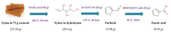The calculated mass balance from corncob to furans is illustrated in Figure 5. In 1 L deionized water containing oxalic acid (50.0 g), corncob powders (75.0 g, dry weight) composed of 25.58 g xylan were placed into an autoclave. After incubation for 40 min at 140 °C under the agitation of 500 rpm, the xylose-rich hydrolysate containing 20.0 g xylose was obtained and placed into a 3 L autoclave. The xylose hydrolysate was separated by simple filtration, and the corncob residual was collected. In this 3 L autoclave containing 1 L of xylose hydrolysate, Sn-DAT-SS powder (20.0 g) was added to dehydrate xylose into furfural at 170 °C within 30 min. The formed furfural solution composed of 7.68 g furfural was regulated to pH 7.0 and further bioconverted into 8.96 g furoic acid by HMFOMUT cells (50.0 g) at 30 °C for 100 h. The sustainable transformation of renewable and low-cost bioresource into furans has gained increased attention in recent years [43,44,45,46]. One efficient chemoenzymatic valorization of lignocellulosic biomass into furoic acid can be realized in a cascade reaction with a heterogeneous chemocatalyst and HMFOMUT cell biocatalysis. The productivity of furoic acid reached 0.35 g furoic acid/(g xylan in corncob).