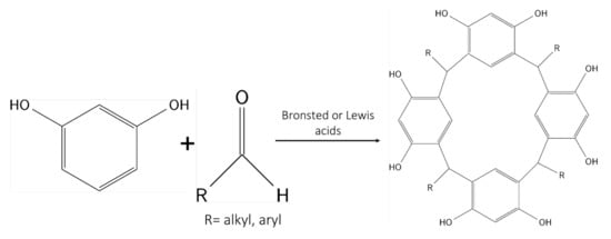 The synthesis of calix[4]resorcinarenes usually involves condensation of either aliphatic or aromatic aldehydes with resorcinol (Figure 1); the reaction is catalyzed by an acid and is carried out using ethanol as solvent [,].