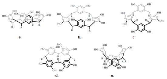 The ability of calix[4]resorcinarenes to form host-guest complexes is based on their structure. These molecules consist of four phenolic residues linked to methylene groups, allowing the conformation of five structures (Figure 2), the most common of which is the crown conformation used for host-guest processes [].