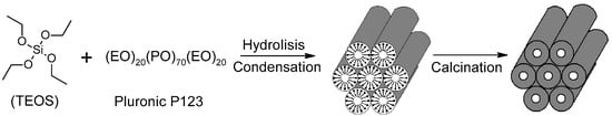 A cooperative self-assembly process is used for the synthesis of SBA-15. For this purpose, a non-ionic triblock copolymer (Pluronic P123) is used as a template, which consists of ethylene oxide (EO) and propylene oxide (PO). On the other hand, tetramethoxysilane (TMOS) or tetraethoxysilane (TEOS) are used as silica sources. The hydrophobic part is made of propylene oxide, while the hydrophilic part is made of ethylene oxide. The process occurs in an acidic medium in two steps: (1) the formation of micelles with hydrophobic groups inward and hydrophilic groups outward; (2) the interaction between water molecules and alkylene oxides as a result of hydrogen bonds [,].