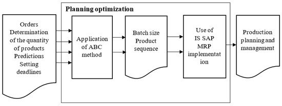 For the proposed methodological framework, the classification of stocks using the ABC inventory analysis is used, the purpose of which is to divide stocks into three main groups. The MRP (Material Resources Planning) method is used to determine the material requirements in terms of the actual needs for particular products as required by customers or based on the forecast of expected market needs. The proposed methodological framework was subsequently tested on a real case-study company from the area of engineering production. The purpose of the methodological framework was to integrate the ABC and MRP methods through the information system SAP ERP in order to optimize the production planning process and ultimately eliminate the costs of the production process.