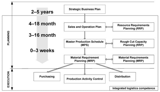 Correct planning is crucial for effective production planning and, subsequently, the quality of products [15]. Materials Resources Planning (MRP) is a technique used to determine the quantities and the times needed to purchase specific goods depending on the demand for the given items based on the requirements of the production schedule. It is a technique that uses a bill of material, inventory, receipts that were estimated, and the master production schedule to determine material requirements [16]. Thus, Material Resources Planning (MRP) schedules material deliveries based on sales forecasts [1].