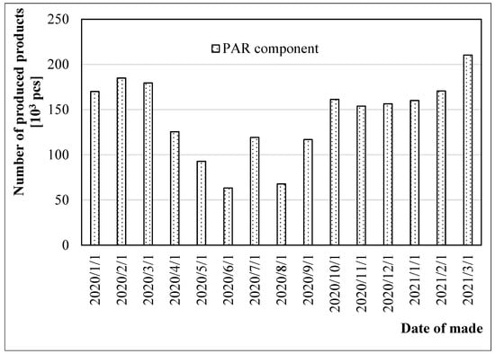 A special pivot table (Table 3) has been designed for the company, which has been applied to the system and will make the work of the planners much easier. The purpose of the pivot table is to offer a simple and undemanding solution with a clear display of data on changeovers in specific product models. In the table, it is possible to practically manage data on each product model, and the result is a classification of models by date. Row labels stand for months, and one can use a link to sort the months into specific days. In addition, under each product, there are the codes of the components used, which are necessary for the model’s production. For an illustration, shows a selected product model (A) and its variants.