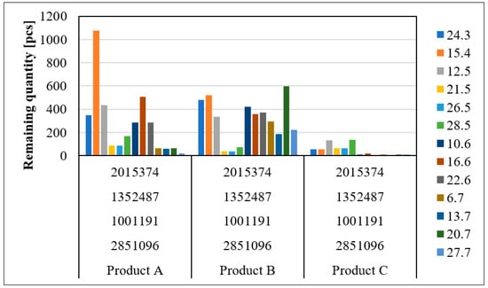 The starting point for solving the planning problem is a four-month production plan for the assembly line. For the purposes of this case study, the ABC analysis was created in the SAP information system. The main criterion for assigning the characters A, B and C to a specific product was the consumption of specific products in the last 60 days. The classification criteria were the elimination of changeovers (downtimes) and the resulting elimination of costs. This strategy is presented in Table 1.