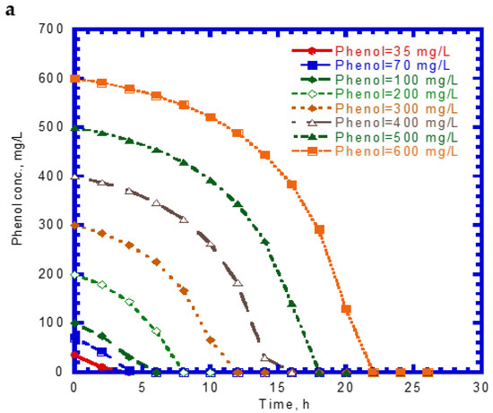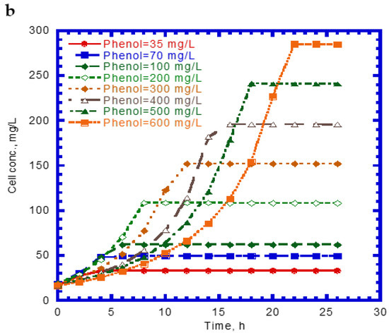 Figure 1 shows the single phenol biodegradation and cell growth as a function of time. No lag phase was found for the phenol biodegradation due to acclimation [33]. The phenol concentration steeply decreased with time at a lower initial nominal concentration in the batch experiments compared to those containing higher initial levels of phenol (Figure 1a). The elapsed time for the complete disappearance of phenol at various initial nominal concentrations of 35 to 600 mg/L ranged from 8 to 22 h. The phenol consumption rate at the onset of the batch experiments was longer with increasing initial nominal phenol concentrations. The variation of cell growth with time is shown in Figure 1b. The cell growth curves follow the log growth and stationary phases. The maximum value of the elapsed time for cell growth at the stationary phase under different initial nominal phenol concentrations ranged from 4 to 22 h. The endogenous phase in the cell growth curves was insignificant.