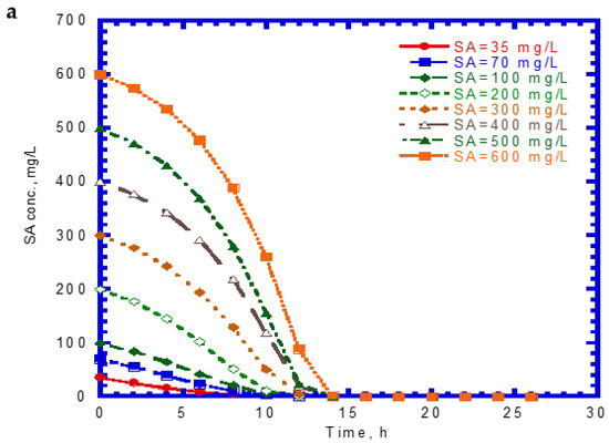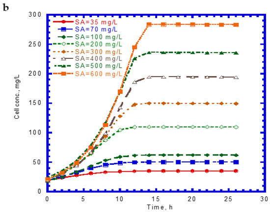 The time course of SA biodegradation and cell growth is shown in Figure 2. The biodegradation of SA started with no lag phase because of the cell acclimation [36]. We observed that the SA consumption rate at the beginning of the tests remained nearly the same. The elapsed time for the complete degradation of SA at different initial nominal SA concentrations (35–600 mg/L) was within 14 h (Figure 2a). The time required for the complete biodegradation of 1.25 mM of SA was below 13 h [24]. The cell growth during the biodegradation of SA also followed the log growth and stationary phases. The time required to achieve the maximum growth value was about 14 h at various initial nominal SA concentrations (Figure 2b). Comparing Figure 1a with Figure 2a, we found that the capacity for SA biodegradation was better than that for phenol biodegradation.