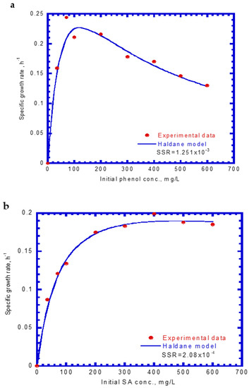 Figure 3 shows that the specific growth rates of the cells varied with different initial phenol and SA concentrations. The experimental results indicate that the cell growth would be inhibited above an initial phenol concentration of 120 mg/L (Figure 3a). However, no inhibition of cell growth occurred under different initial SA concentrations (Figure 3b). Notably, the cell growth on phenol was more inhibited than that on SA under the studied conditions (Figure 3a,b). The Haldane cell growth kinetics model was widely applied to evaluate the kinetic constants containing the maximum specific growth rate (μm), half-saturation constant of the substrate (KS), and self-inhibition constant of the substrate (KI). The experimental results of the specific growth rate were obtained from the log growth phase under initial nominal phenol and SA concentrations. The Haldane cell growth kinetic model was fitted to the experimental data using the “Solver” function in Microsoft Excel 2016 by minimizing the sum of square error (SSE). The Haldane cell growth kinetic model was expressed by the following equations for single phenol and SA, respectively: