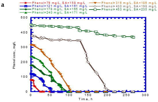The μm,P value (0.423 h−1) for cell growth within the literature report ranging from 0.33 to 0.57 h−1 [37]. However, the present KS,P value (48.1 mg/L) was greater that the literature ranges of 1.03–18.5 mg/L owing to the different nutrient medium used in the batch tests [37]. The KI,P value (272.5 mg/L) falls within the literature ranges of 54.5–903.3 mg/L [37]. Notably, SA was degraded more rapidly than phenol by the P. putida cells because it has a much larger KI value than phenol, which make the cells less sensitive to substrate inhibition. This result is consistent with that reported by Wang and Loh [33] who evaluated the batch cultures of P. putida ATCC 49451 in a medium for the degradation of single phenol and sodium glutamate (SG). Their experimental data were fitted by Haldane kinetics to determine the kinetic constants (μm, KS, and KI). The KI values for phenol and SG were 284.3 and 14,560 mg/L, respectively. The KI value for phenol obtained here (272.5 mg/L) was comparable to that in their study.