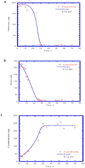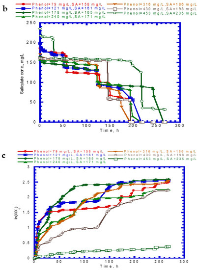Table 1 presents the kinetic constants of phenol and SA for the chemostat model input. In chemostat experiments, the dilution rate was controlled at 0.04 h−1, which yielded a hydraulic retention time of 25 h. The initial feed concentrations of phenol and SA were 192 and 286 mg/L, respectively. Time course profiles of phenol, SA, and cell growth are shown in Figure 10. The predicted values of the chemostat model exhibited a good agreement with the experimental results of phenol and SA utilization and cell growth. The phenol effluent concentration curve followed the lag phase, rapid degradation, and steady stages (Figure 10a). The time for the lag phase was 12 h prior to the onset of phenol degradation. The reason for the occurrence of the lag phase was because phenol has a much lower KI value than SA. The phenol effluent concentration decreased from 192 mg/L to approximately 6.6 mg/L during the transient period of 20 h. The phenol effluent concentration was about 6.6 mg/L at the steady state during the operation time of 32–70 h and achieved a removal efficiency of 96.6%. The SA effluent concentration curve had two stages that contained rapid degradation and steady-state removal (Figure 10b). No lag phase was observed before the start of SA degradation. The SA degraded abruptly from 286 to 8.5 mg/L during the transient period of 26 h. A high SA removal efficiency of 97% was observed at the steady stage. The variation of the cell growth curve over time is plotted in Figure 10c. No lag phase occurred for cell growth during the operation time. The cells grew rapidly during the period of 28–70 h and the cell concentration reached a constant level. The cell concentration at the steady-state concentration was 232.5 mg/L.
