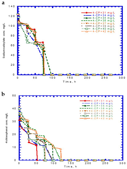 The experimental results of cell growth on SA alone were used to determine the kd,A value (Figure 2b). The kd,A value can be evaluated from the slope of a linearized plot of ln (X/X0) against time in the endogenous stage even though the decay rate value was considerably small. The kd,A value obtained from eight test runs was 1.64 × 10−4 ± 2.15 × 10−5. Eight batch experiments were conducted using initial 4-CP contents ranging from 31–42 mg/L, while the initial SA content was maintained at 124 mg/L. The variations of SA, 4-CP, and cell growth are shown in Figure 6. The degradation of SA and 4-CP presented several intermediate lag phases during the time course because the 4-CP toxicity caused the inhibition of cell growth. The complete removal of SA was achieved in the time range of 74–96 h (Figure 6a). The time required for the complete degradation of 4-CP was 52–122 h at various initial 4-CP contents (Figure 6b). The time course of cell growth followed the log growth, intermediate lag phase, log growth phase, stationary phase, and endogenous phase (Figure 6c). The intermediate lag phase for cell growth was long (about 30 h). The biphasic growth observed from the experimental results was consistent with that reported by Wang et al. [23], who used phenol and SA as the growth substrates to cometabolize 4-CP.