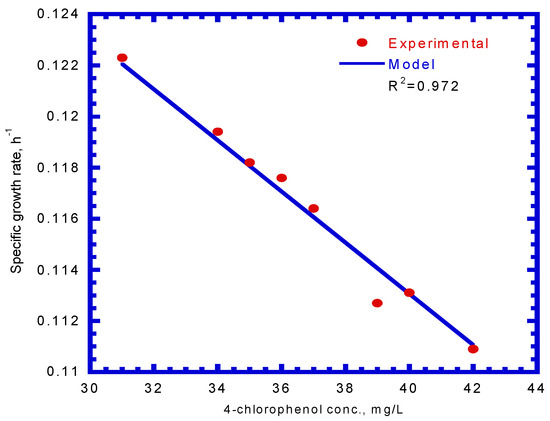 The cell growth kinetics of SA in the presence of 4-CP was expressed by Equation (9). Using previously evaluated kinetic constants (μm,A, KS,A, KI,A, and kd,A) from batch tests, the only undetermined kinetic constant, md,CP, obtained from the model fitted to the experimental results shown in the Figure 7 was 6.11 L/mg. Thus, Equation (9) can be written as: