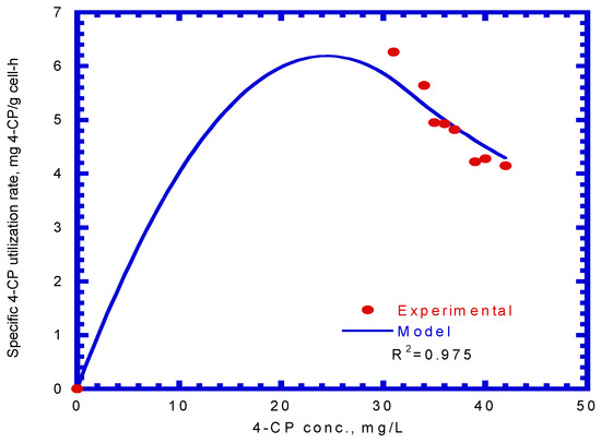 The value of the correlation coefficient (R2) was 0.975. Hao et al. [38] used the Haldane kinetic model to describe the 4-CP inhibition on its transformation using the resting cells of the Acinetobacter species. The Haldane model was fitted to the experimental results to evaluate the values of kCP, KS,CP, and KI,CP (Equation (13)), which were 0.15 mg 4-CP/mg cell-h, 0.15 mg 4-CP/L, and 60 mg 4-CP/L, respectively, in their study. Only the kCP value was close to that obtained in this study because different cells species and nutrient media result in different kinetic values.