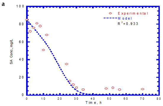 The specific degradation rate of SA described in Equation (12) was used to determine the value of ICP. The maximum specific degradation rate of SA (kA) was evaluated from the eight batch experiments on single SA. The kinetic constants (μm,A, and YA) obtained from each run were used to determine the kA using Equation (4). The average values for μm,A and YA are 0.247 h−1 and 0.438 ± 0.0058 mg cell/mg SA, respectively. The kA value is 0.564 mg SA/mg cell-h. Therefore, the average value for ICP is 0.355 ± 0.0779 mg/L.