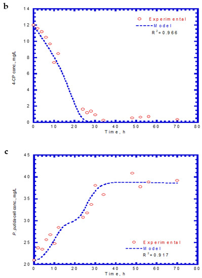 The specific degradation rate of 4-CP by P. putida cells was expressed by Equation (13). By comparing the experimental data with a kinetic model using a non-linear least square regression method from Figure 8, the kinetic constants, kCP, KS,CP, and KI,CP, were evaluated to be 0.189 mg 4-CP/mg cell-h, 1.106 mg/L, and 0.977 mg/L, respectively. Therefore, the resulting kinetic model is expressed as