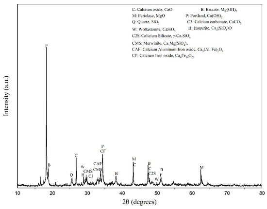 Electric arc furnace ladle slag (EAFLS) has been used as civil engineering material such as road base layers and hot asphalt mixtures [4,5]. However, it cannot replace or be added into Portland cement due to its high content of free lime (free-CaO) [6,7,8]. Free-CaO and free-MgO may lead to volume expansion in a solid structure, and if the expansion stresses exceed the tensile strength of cement paste, cracks will occur [9]. This is a result of the hydration reactivity of free-CaO and free-MgO, which is slow and causes delays in expansion. Thus, the utilization of EAFLS is restricted, which means that solving the volume expansion problem is vital for slag recycling and reuse [10,11,12,13,14,15]. Previous research proposed specific weathering, curing treatment, and autoclave method to reduce volume expansion of steel slag [16,17,18]. For example, open porosity is reduced after weathering and improving slag properties. The durability can also be strongly improved even in critical freezing/thawing environmental conditions by a small amount of air-entraining agent. However, the time for stabilizing furnace slag is related to the properties of the slag itself, so these methods may be time-consuming.