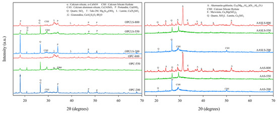 XRD patterns of OPC, OPCLS, AAS, and AASLS at various temperatures.