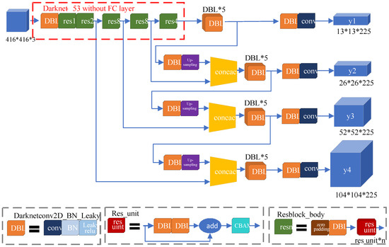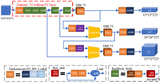 As shown in Figure 1, the image input size of the YOLOv3 network is 416 × 416 × 3. The Darknetconv2D_BN_Leaky (DBL) component is the most used module in YOLOv3, which includes a convolution layer (Conv), batch normalization (BN), and Leaky ReLU activation function. After that, the connected part isthe residual block (Resblock_body), which is composed of zero padding, DBL, and n residual units (Res_unit); the values of n are 1, 2, 8, and 4; and then two DBL components are used for a jump connection to form a residual unit. The above parts constitute the backbone network for image feature extraction.