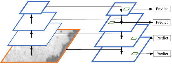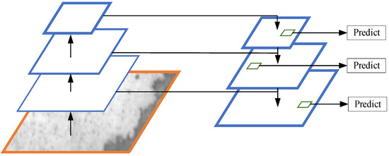 In order to further improve the detection ability of the YOLOv3 network for small-object defects of industrial structures, this paper continues to use the FPN principle, shown in Figure 7, to add a scale prediction, and to set the characteristics to four scales, namely, 13 * 13, 26 * 26, 52*52, and 104 * 104. The fourth scale can use the shallow-detail information and deep-feature-semantic information for defecting-object detection, which not only improves the image processing ability of the network, but also enhances the robustness of the network.
