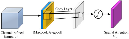 The spatial attention module is used to compress the data on the channel and focus on obtaining the effective information in the channel. As shown in Figure 5, after the channel attention mechanism processing is completed, the generated feature graph and the input feature graph are multiplied by the elementwise feature as the input of the spatial attention module, and the input feature graph is pooled in the channel dimension by using the average pooling and maximum pooling methods to generate two feature graphs, which are combined into a new feature map. Because the dimension of the feature graph of the spatial dimension is different from that of the input feature graph, so the convolution operation is needed to keep it consistent, and then activate it through a sigmoid activation function to finally output the spatial attention feature graph. For the input feature F, the mathematical expression of its spatial attention module is shown in Equation (6).