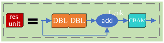 CBAM integrates channel attention and spatial attention, which not only ensures the acquisition of important channel information, but also ensures the acquisition of important information of characteristic areas. CBAM is widely used in residual network structures, and the YOLOv3 algorithm uses residual network structures to reduce gradient disappearance. Therefore, CBAM is embedded in the YOLOv3 network in this paper. As shown in Figure 6, the embedding of attention mechanisms can be completed by adding a CBAM module behind the residual unit.